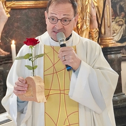 So wie die Sonne an diesem Sonntag strahlte, strahlten auch die Jubelpaare und sie waren berührt von den Texten und der Musik, der einfühlsamen Predigt von Vikar Gerhard Hatzmann, den Gebeten und Segensworten. Die Rose mit dem Segensröllchen wird sie noch länger an die herzliche Feier erinnern.