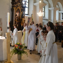 So feierten Groß und Klein mit Vikar Gerhard Hatzmann und Diakon Michi Zepf die heilige Messe zum Palmsonntag in einem schönen Miteinander. Die Kindergartenkinder sowie einige MS-Schülerinnen gestalteten die Feier mit und die MINIS versahen nicht nur ihren Dienst am Altar, sondern trugen auch die „Passion“ vor - in einer einfacheren Fassung, mit passenden Liedstrophen und Symbolen. Auch die Landjugend nahm teil und kam nach guter Tradition mit ihrem großen Palmbuschen.